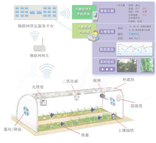 溫室大棚智能管理系統, 利用GPRS、物聯網技術,實現實時遠程 獲取溫室大棚內部的空氣溫濕度、土壤水分溫度、CO2濃度、光照強度及視頻圖像,通過 模型分析 ,遠程或自動控制濕簾風機、噴淋滴灌、內外遮陽、頂窗側窗、水肥一體機、加溫補光等設備,保證溫室大棚內環